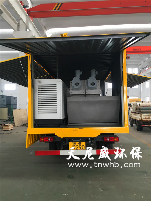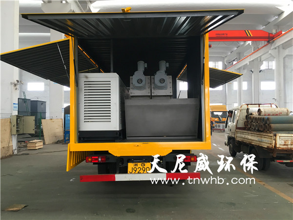 車載式污泥脫水機(jī)(另稱:化糞池清理車、移動脫水機(jī)),包括車體、污泥壓干機(jī)、進(jìn)料泵和攪拌裝置,所述進(jìn)料泵安裝在所述車體的一側(cè),在所述進(jìn)料泵的出口端連接著管道,所述管道的另一端連接著所述攪拌裝置,所述攪拌裝置中設(shè)有空氣壓縮系統(tǒng),所述攪拌裝置的污泥出口處連接著所述污泥壓干機(jī),所述污泥壓干機(jī)的出處依次連接著皮帶機(jī)和集裝箱,所述攪拌裝置、污泥壓干機(jī)和皮帶機(jī)安裝在所述車體的中部,所述集裝箱安裝所述車體的后方。