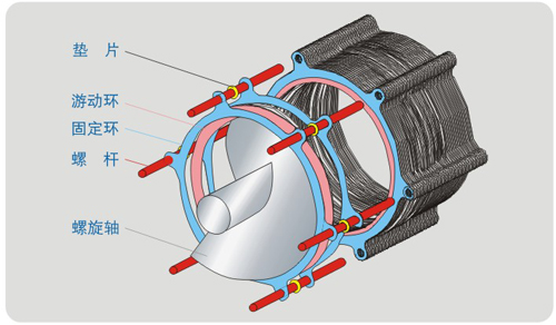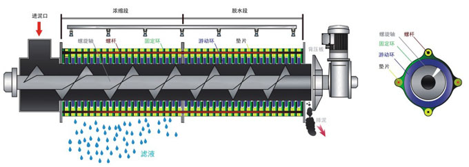 疊螺污泥脫水機是運用了螺桿擠壓原理,通過螺桿直徑和螺距變化產(chǎn)生的強大擠壓力,以及游動環(huán)與固定環(huán)之間的微小縫隙,實現(xiàn)對污泥進行擠壓脫水的一種新型的固液分離設備。